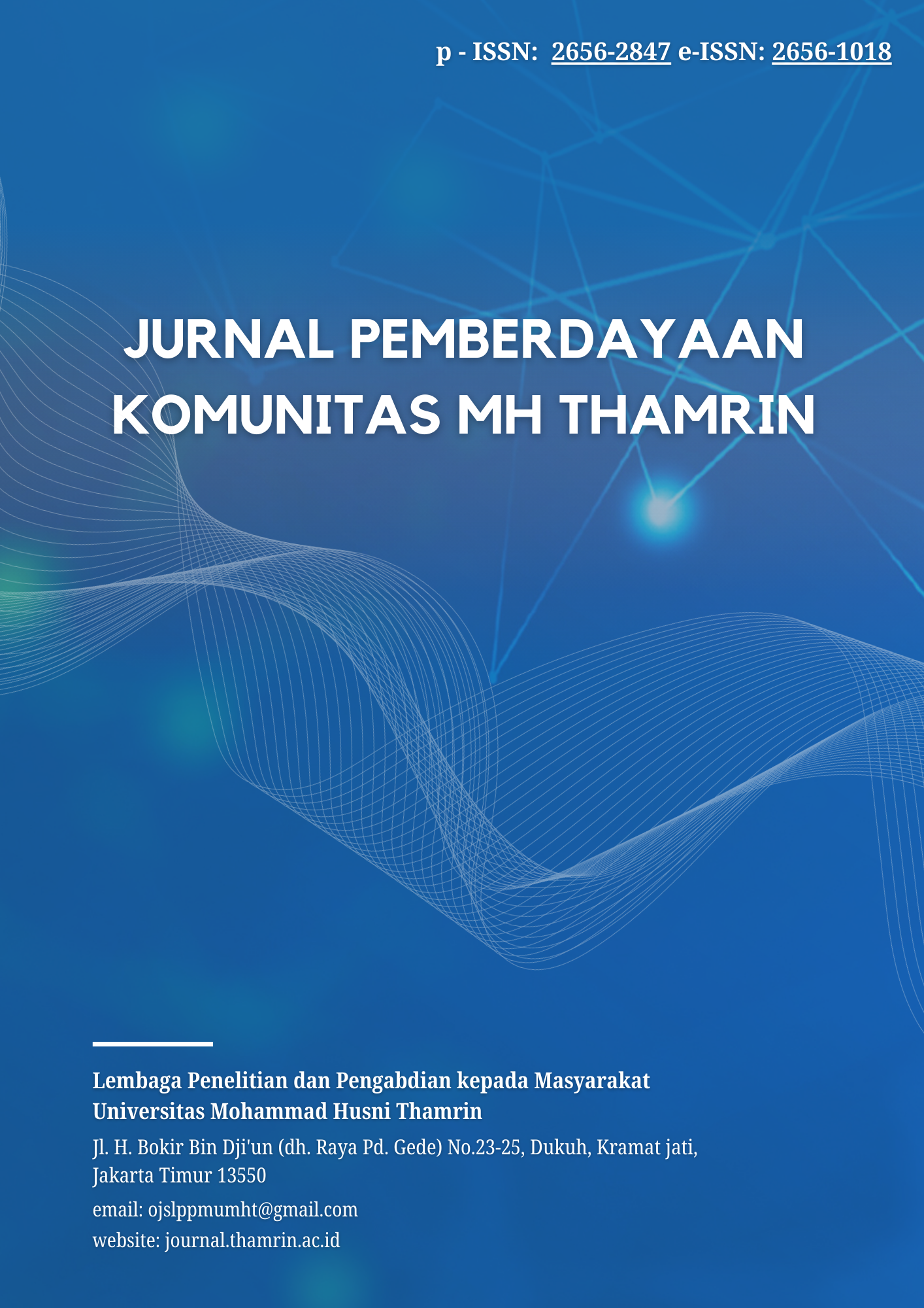 Jurnal Pemberdayaan Komunitas MH Thamrin (p-ISSN 2656-2847 and e-ISSN 2656-1018) is a scientific multidisciplinary journal published by Directorate of Community Services Universitas Mohammad Husni Thamrin. It is in the national level that covers a lot of common problems or issues related to community services. The aim of this journal publication is to disseminate the conceptual thoughts or ideas and research results that have been achieved in the area of community services.