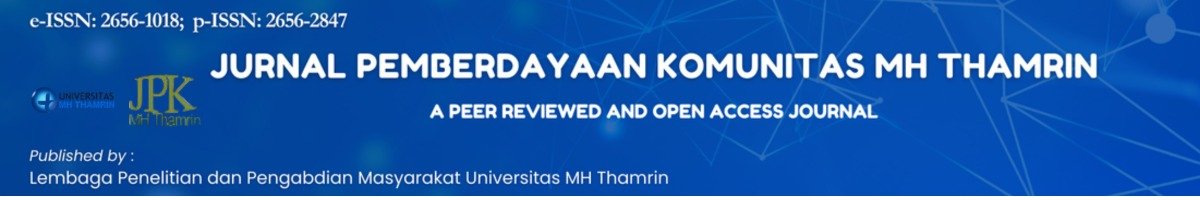 Jurnal Pemberdayaan Komunitas MH Thamrin allows readers to read, download, copy, distribute, print, search, or link to the full texts of its articles and allow readers to use them for any other lawful purpose. The journal allows the author(s) to hold the copyright without restrictions. Finally, the journal allows the author(s) to retain publishing rights without restrictions Authors are allowed to archive their submitted article in an open access repository Authors are allowed to archive the final published article in an open access repository with an acknowledgment of its initial publication in this journal.