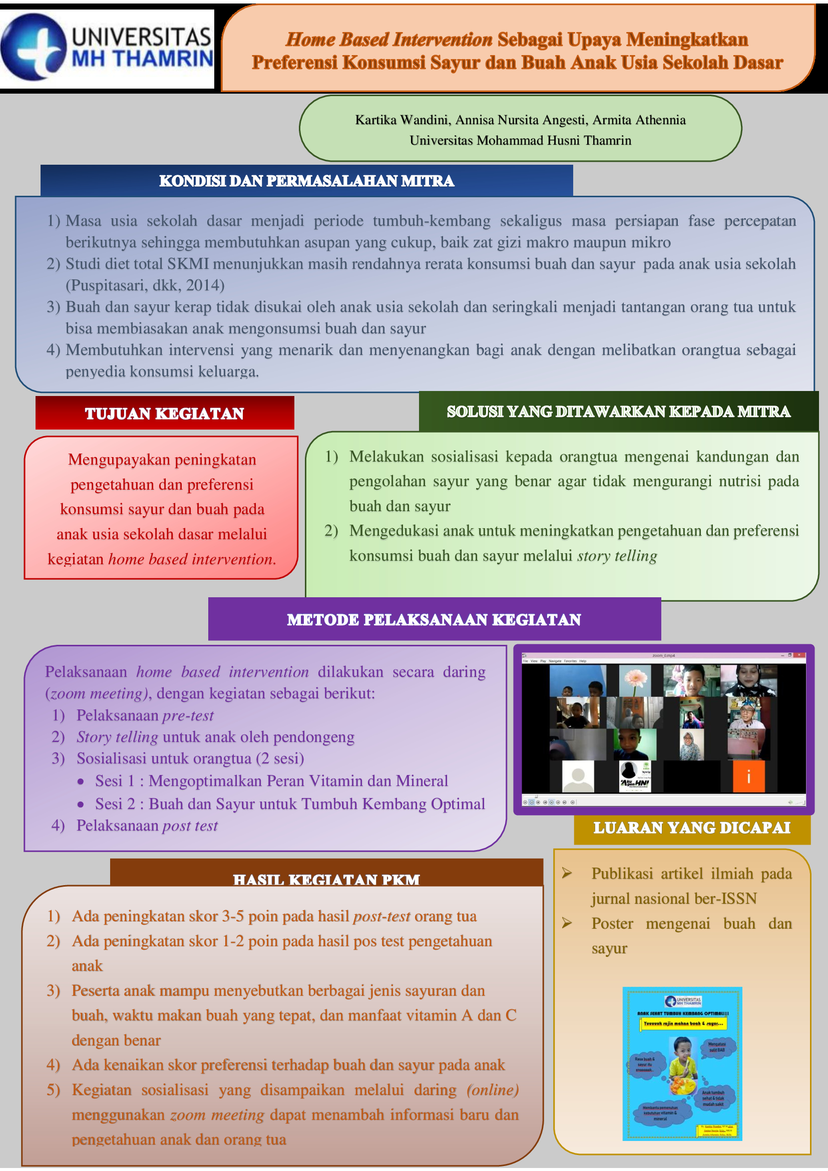 Masa usia sekolah dasar menjadi periode tumbuh kembang anak, dimana kecukupan zat gizi makro dan mikro harus terpenuhi. Namun demikian orang tua kerap menghadapi tantangan untuk bisa membiasakan anak mengonsumsi buah dan sayur yang kaya akan zat gizi mikro. Kegiatan ini bertujuan untuk mengupayakan peningkatan pengetahuan dan preferensi konsumsi buah dan sayur pada anak usia sekolah dasar melaui kegiatan Home Based Intervention. Pelaksanaan kegiatan dilakukan secara daring (online) menggunakan zoom meeting dengan melakukan storytelling untuk anak oleh pendongeng dan sosialisasi untuk orangtua oleh ahli gizi. Pada kegiatan ini, pengetahuan dan preferensi anak dilihat dari pengisian kuesioner pre-test dan post-test. Sebanyak 21 orang tua dan 11 anak mengikuti pre-test kegiatan ini. Hasil post-test menunjukan terdapat kenaikan skor pengetahuan orang tua sebanyak 3 sampai 4 poin dan skor pengetahuan anak sebanyak 1-2 poin. Skor preferensi konsumsi sayur dan buah pada anak pun mengalami kenaikan sebesar 1 dan 5 poin. Kegiatan Home Based Intervention melalui storytelling pada anak dan sosialisasi pada orang tua pada dasarnya memberi efek positif terhadap preferensi serta pengetahuan anak dan pengetahuan orang tua, namun demikian perlu adanya sosialisasi secara frekuentif guna memberi efek yang lebih nyata pada perilaku konsumsi buah dan sayur pada anak.